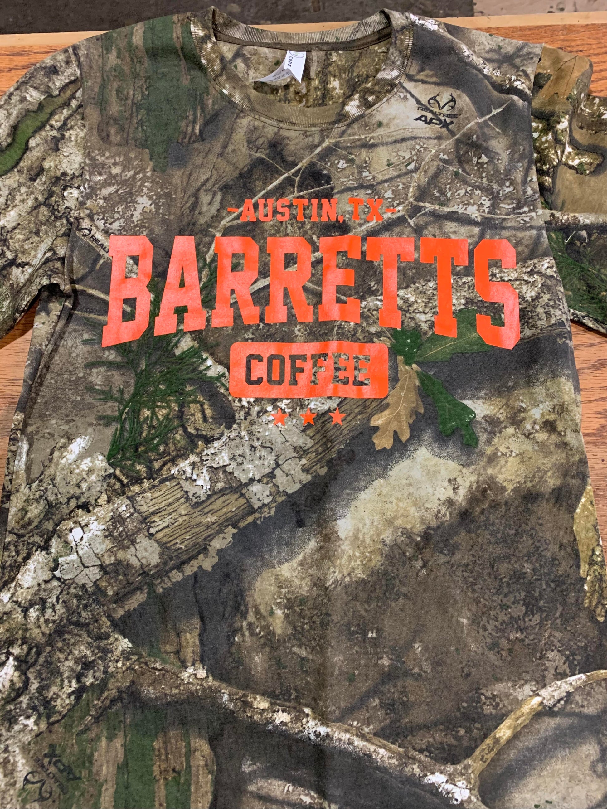 Realtree Camo shirt with hunter orange lettering.
